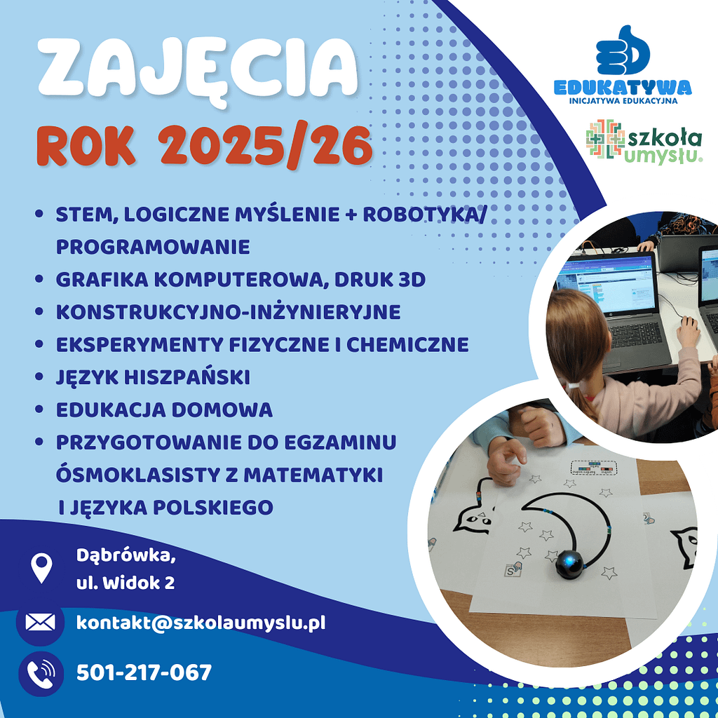 kontakt@szkolaumyslu.pl, tel. 501217067